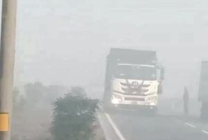 हाईवे पर कोहरे के बीच से गुजरते वाहन।-