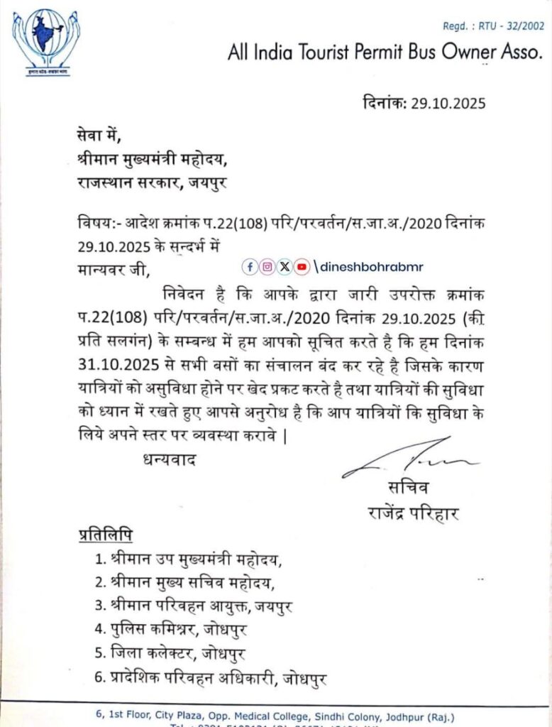 •RTO की लगातार कार्रवाई के बाद ऑल इंडिया टूरिस्ट परमिट बस ऑनर एसोसिएशन ने अनिश्चितकालीन हड़ताल का फैसला लिया है। एसोसिएशन के सचिव राजेंद्र परिहार ने आदेश जारी कर यह जानकारी दी है। जोधपुर समेत कई शहरों में प्राइवेट ट्रेवल्स एजेंसियों ने ऑनलाइन बुकिंग भी बंद कर दी है।